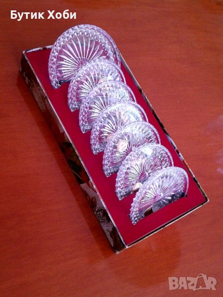 Комплект от 7 кристални чинийки, Германия. Ръчно шлифовани. В перфектно състояние са! Диаметър: по-голямата - 10,5см; малките - 8,5.