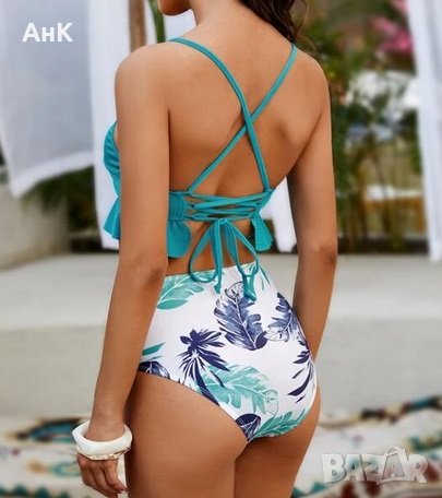 Бански костюм с регулиращо тюркоазено-зелено горнище и бяло долище с цветя, с висока талия, снимка 1 - Бански костюми - 36652866 Бански костюм с регулиращо тюркоазено-зелено горнище и бяло долище с цветя, с висока талия, снимка 2 - Бански костюми - 36652866 1/2