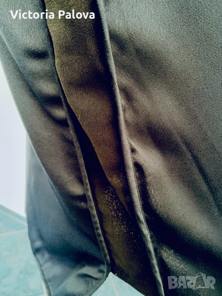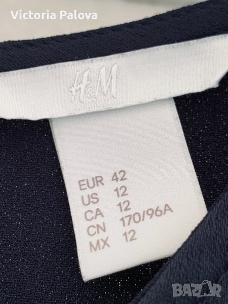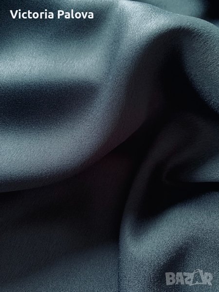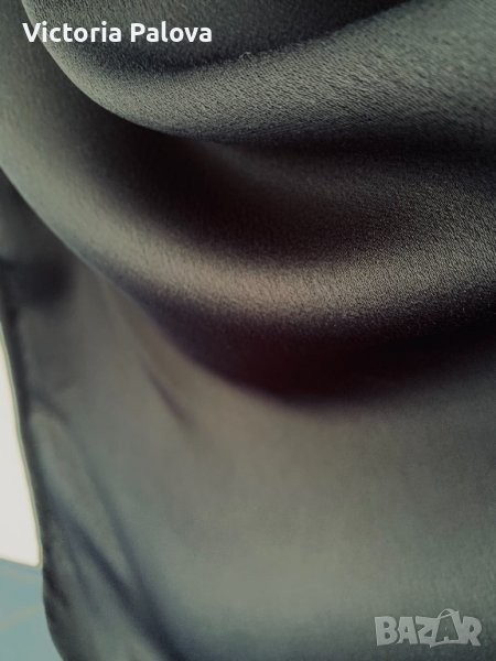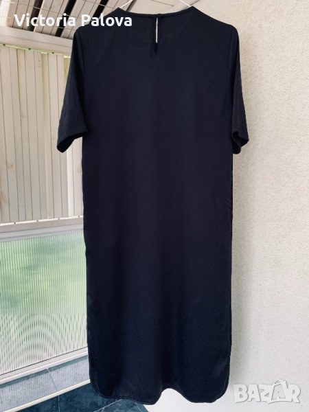 Изключително удобна плътна изчистена рокля -тъмно-синьо до черно,от двете страни има интересни по-къси вставки.материята е тежка и гладка,с блясък,не описва дефекти на фигурата,а ги скрива.роклята може да се ползва както за специални случаи,така и като кежуал.рамене-40-42см,ГО-54см,ханш-58см,дължина-114-115зм.