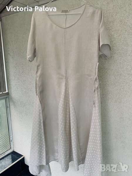 Неупотребявана рокля-лека и красива,100% памук,пастелен цвят,асиметрия в долния край,по 4 връзки отстрани за регулиране на широчината.рамене-42см,ГО-58-59см,дължина в дългата част-127см,в късата-107см.