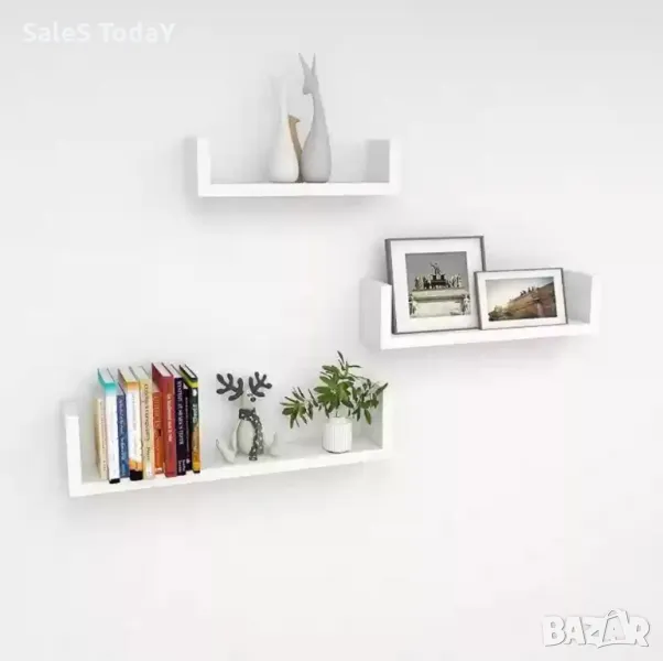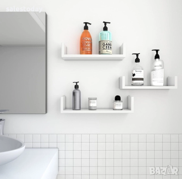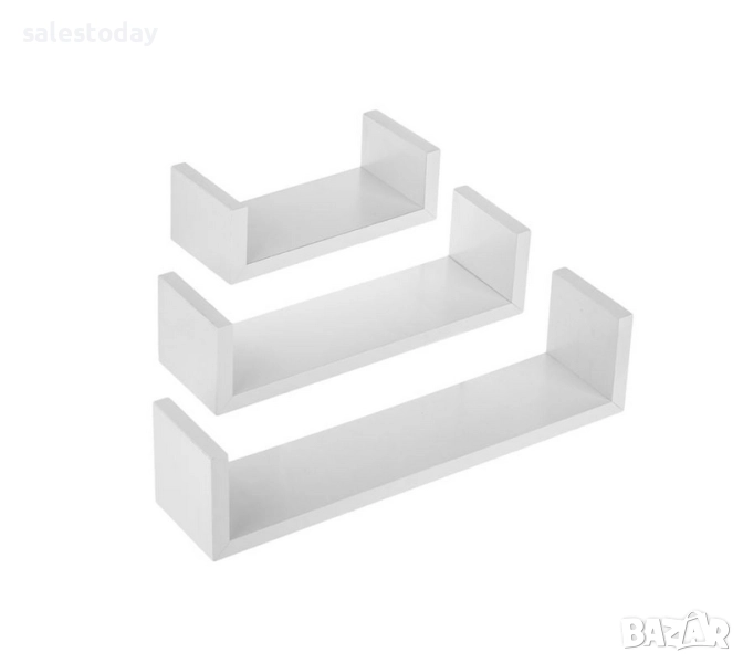 Бели дървени стенни рафтове с лесен монтаж и скрити опори на гърба, с размери 42.5x10.2x10.2 cm, 35.5x10.2x8.7 cm & 22.5x10.2x7.2 cm. 6-те винта и шайби са включени.