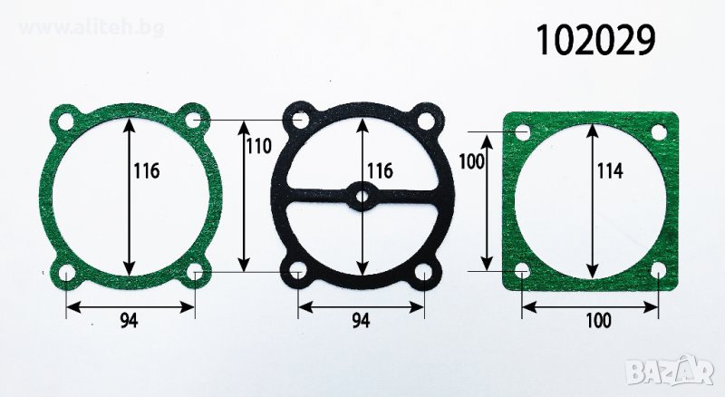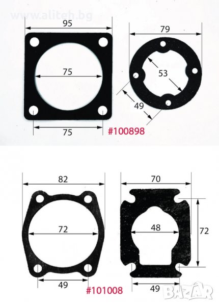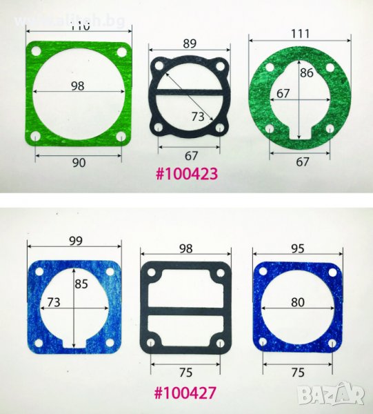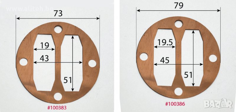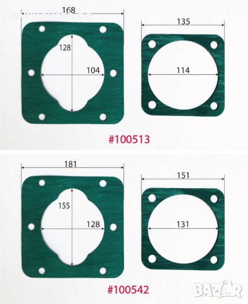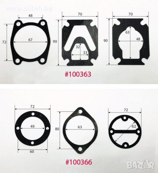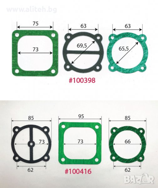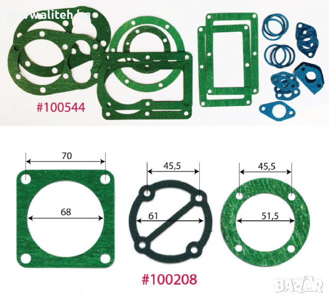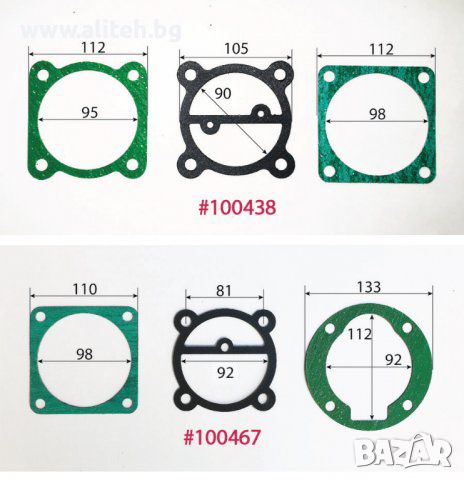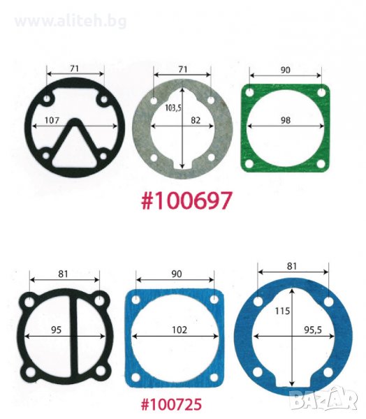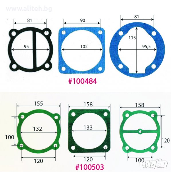 Гарнитура за компресор. За поръчка сравнете размерите и цитирайте шестцифрения код (червените цифри). Моля приемете грешка в измерванията +/- 1мм.
