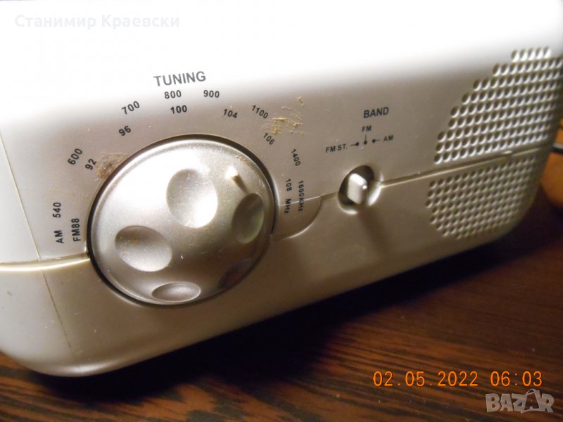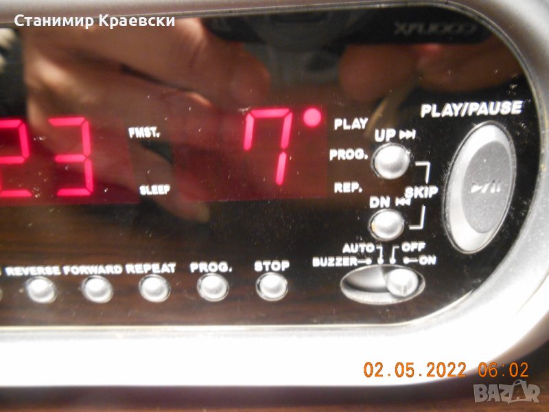 Радио часовника работи без забележки 2 аларми с опция зумер или радио Диска също работи Радиото е аналогово и работи отлично Стерео индикатор на предния панел Забележка по хрома на капака на диска Корпука е отличен без забележки Часовника е тестван 1 ден на диск и радио и не е показал нередности