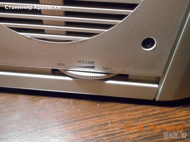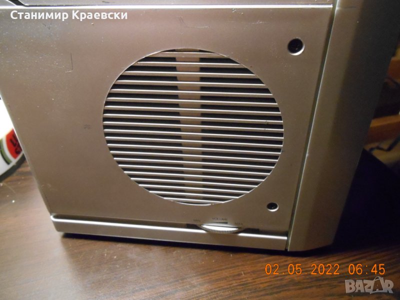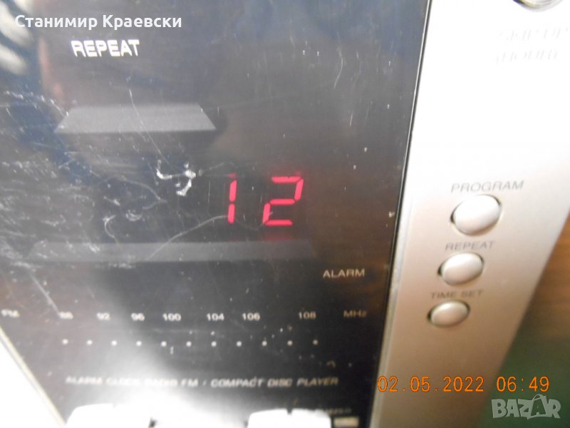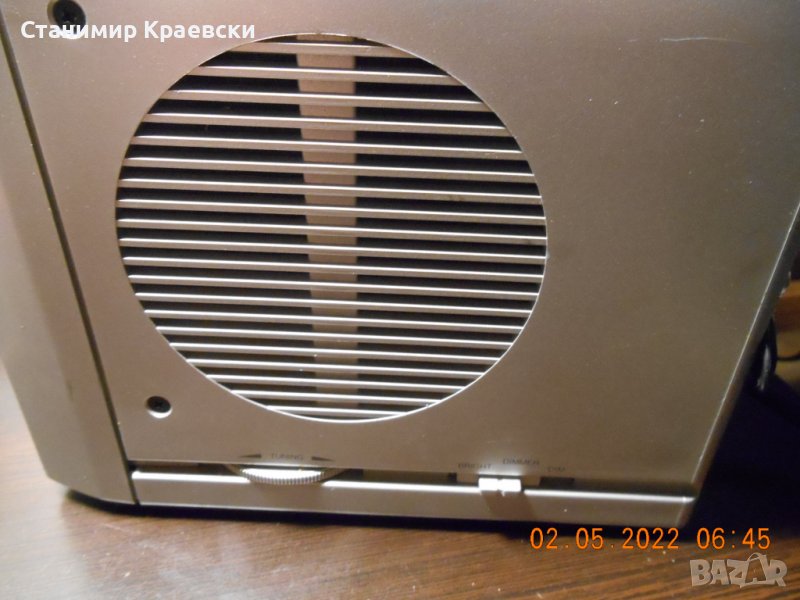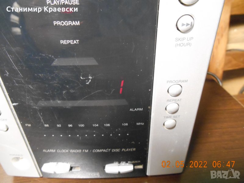 Радио часовника работи безпроблемно но диска си чете когато си иска Нормални следи от употреба с дръскотини по предния панел Има 2 аларми и 2 говорителя а радиото е аналогово със светодиод на предния панел Става за офис или гараж да се слуша радио