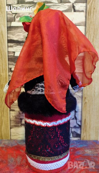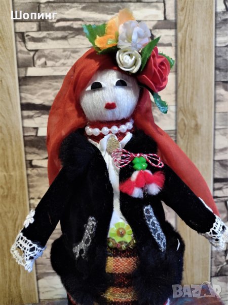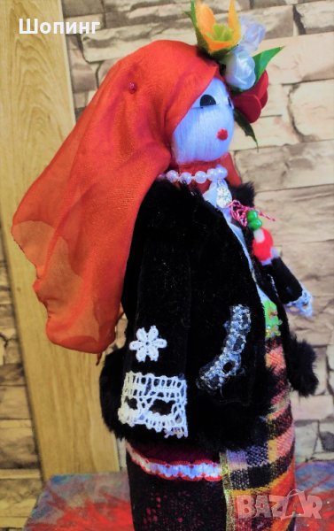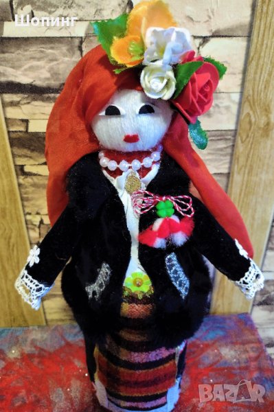 носия. 34 см височина. С гердан, мартеница, кожух от плюш кадифе и пух, престилка, шевици, дантели, пайети, копринен шал... С внимание към всеки детайл, изцяло ръчно изработена от майсторските ръце на сръчна кукларка.