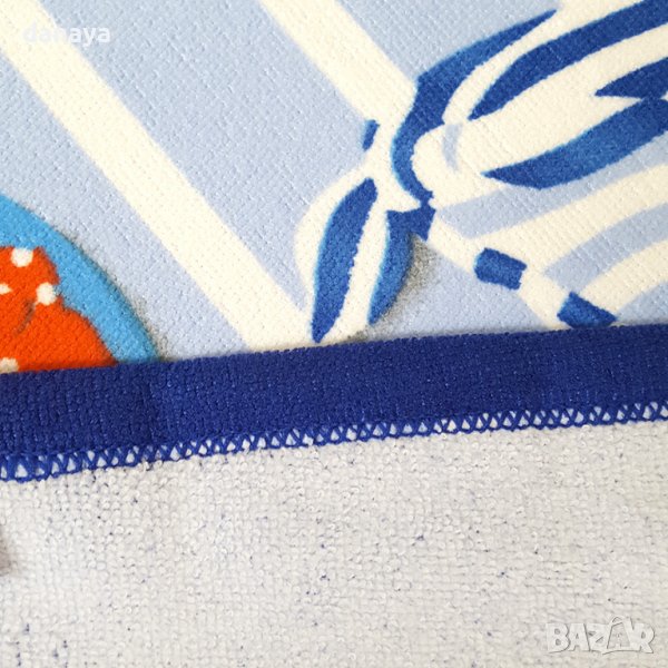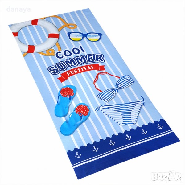 Плажна хавлия в свежи ярки цветове в синята гама с принт на джапанки, слънчеви очила, бански и обещаващ надпис за това лято “Cool Summer”. Изработена е от качествен бързосъхнещ микрофибър. Плажната кърпа не задържа ситния пясък. Може да се пере в пералня до 40 градуса. Ултра лека и удобна при пътуване. Супер мека и приятна на допир. Размери 70х150см. Хавлия за плаж със супер свеж летен дизайн.