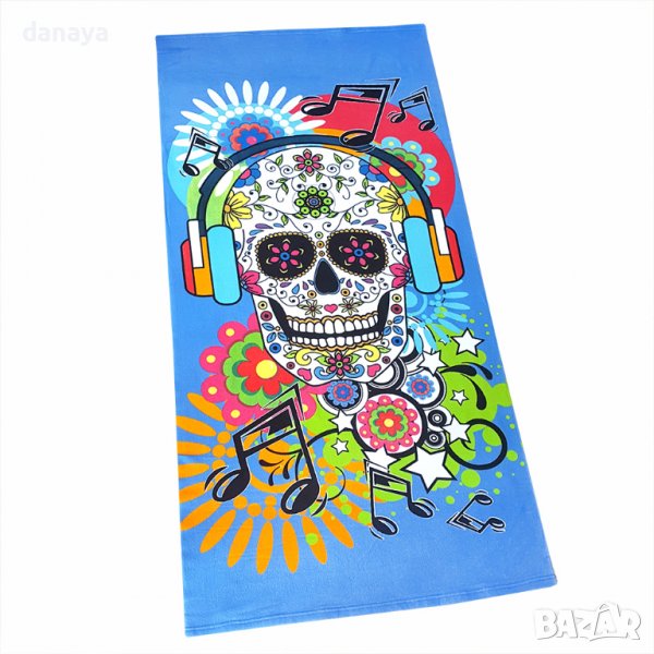 Плажна хавлия в свежи ярки цветове в синята гама с принт на голям музикален череп. Кърпа за плаж изработена от качествен бързосъхнещ микрофибър. Плажната кърпа не задържа ситния пясък. Може да се пере в пералня до 40 градуса. Ултра лека и удобна при пътуване. Супер мека и приятна на допир. Размери 70х150см. Хавлия за плаж със супер свеж летен дизайн.