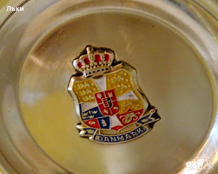 златен бронз.В центъра на чинийката е герба на Дания от бронз с цветен клетъчен емайл.Маркирана Danica-bronce ildfast.Диаметър 9 см.,височина 1 см.,тегло 40 гр.
