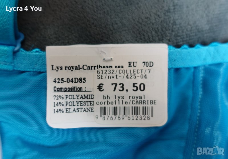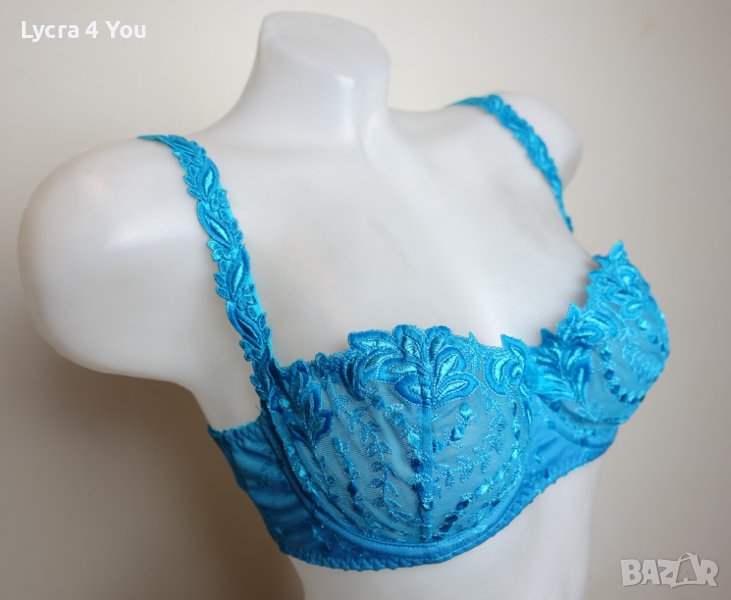 Чисто нов с етикети луксозен сутиен 70/75D размер Louisa Braco Paris цвят 'карибско синьо' с бродерии по чашките и тюл . Презрамките също са с бродерии, а между чашките има малко мънисто. Чашките са меки с банели и лека прозрачност.