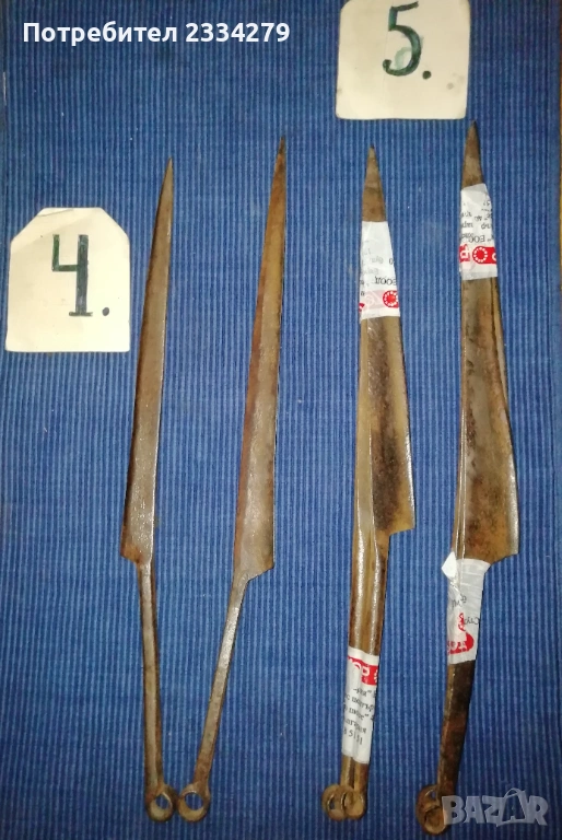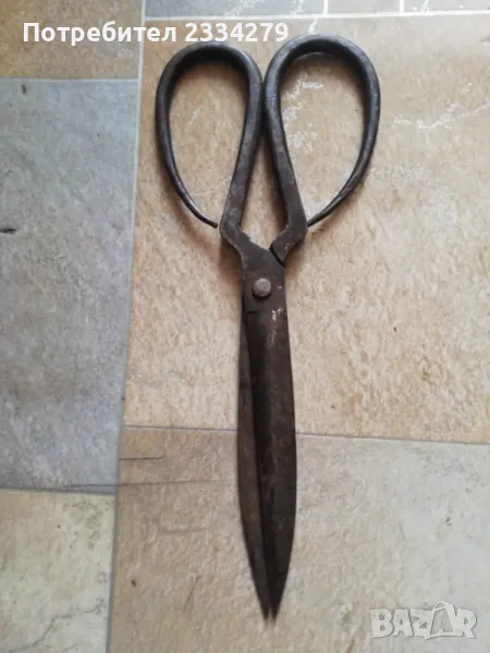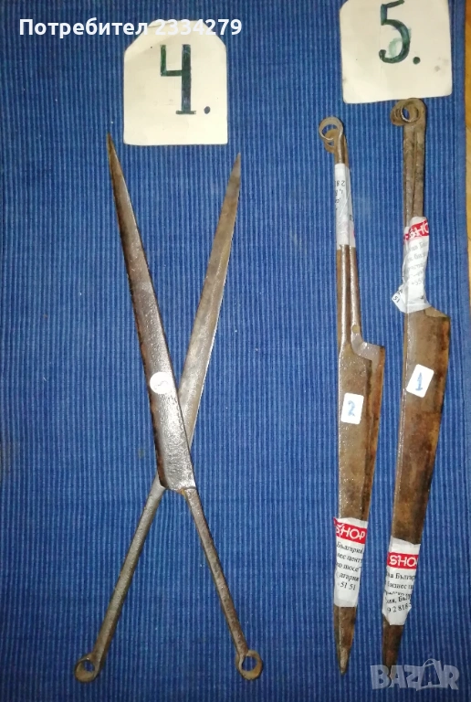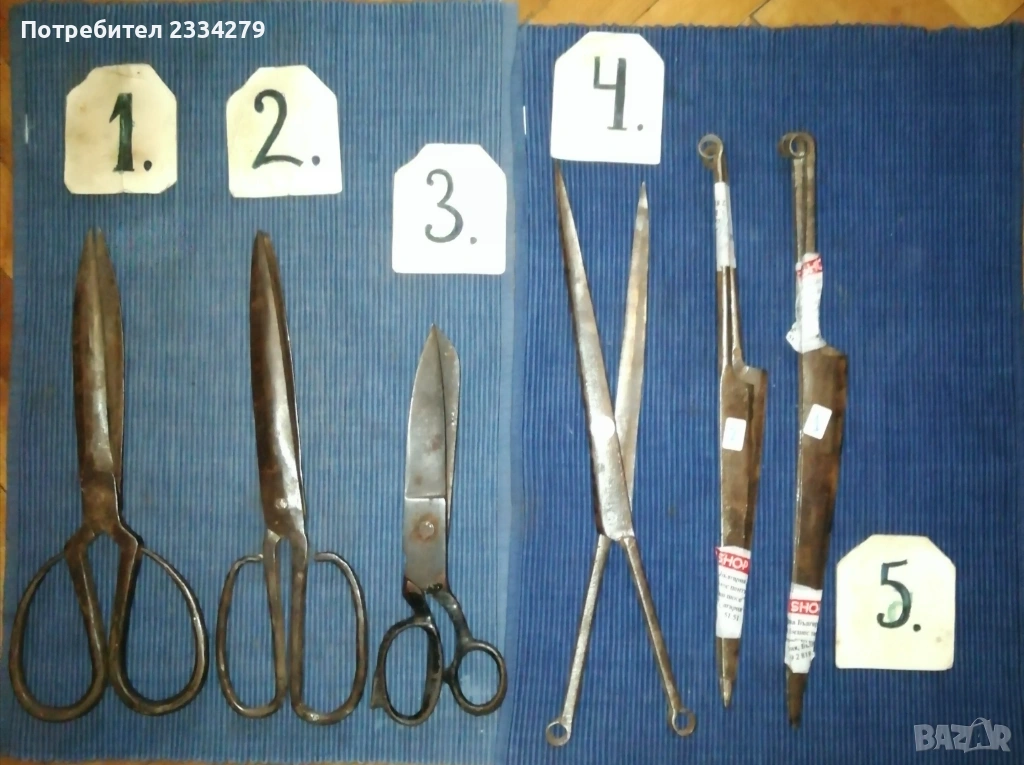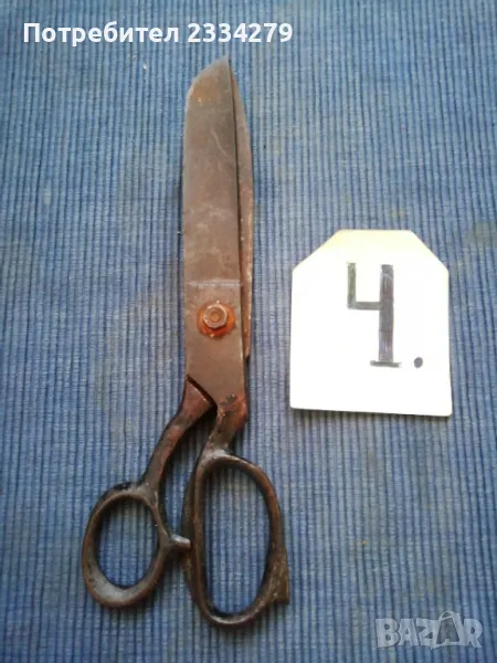 N:1 ръчно изкована от възрожденски майстор, размери: 30х9., цена 16€.; N:2 стара шивашка ножица арабаджийска от възрождението,размери 30х12см., цена 16€.; N:3 шивашки ножици с размери 23х8см., цена 7€.; N:4,5 стари възрожденски ръчно ковани ножици за стригане на вълна рязане, размери 35х3см.,100% автентичност с цена 15€. за чифт. Има три чифта.
