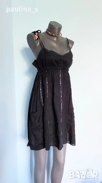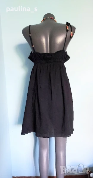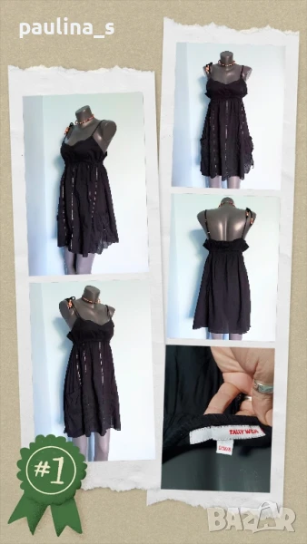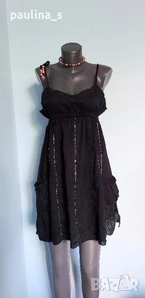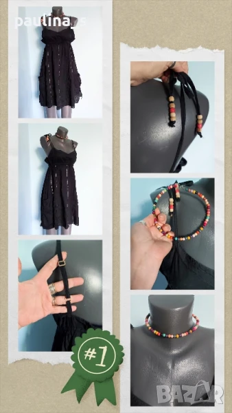 3️⃣. Колаж / M / 2XL - "Tally Weil". Цената е крайна 19,99лв. Черна плажна рокля с бюстие и разкроение. Долу има декорации от пайети, бродерия и с декоративни джобове. Презрамките се регулират индивидуално. По етикет е S, но е уголемена. Материята 100% органичен памук, с прозрачност. Не е чисто нова, но е без дефекти, скъсано или други подобни. Регулацията на презрамките и мънистата са реставрирани от мен. Колието тип чокър с подходящи мъниста е 7,99лв, предпочитам да не се делят.