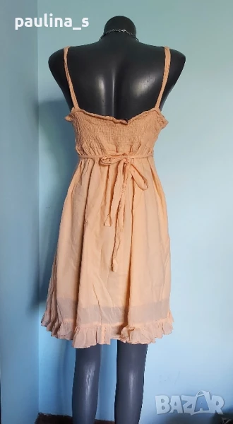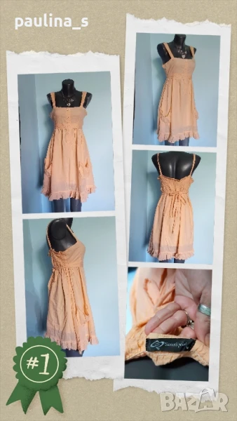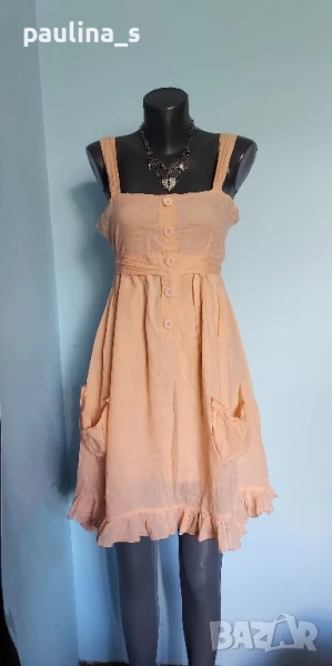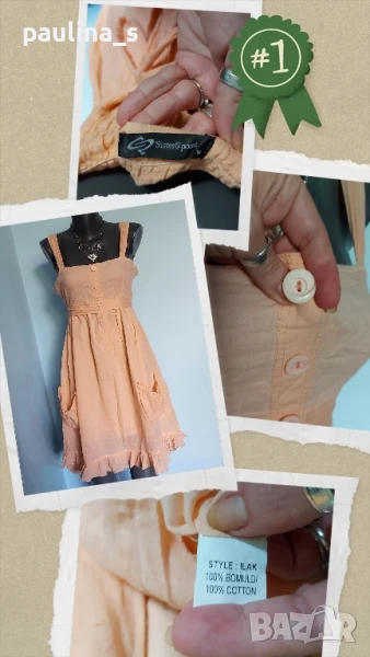2️⃣. Колаж / L / 2XL - "SisterS point". Цената е крайна 19,99лв. Уникална рокля тип туника от индийки памук, с подплата, бюстие и джобове. Цветът е "Прасковен оранж". Коланът започва от предната част като дипла, копчетата са много подходящи и релефни. Има 2 декоративни джоба отпред, а долу завършва с малък волан, за шик! Без дефекти, скъсано или други подобни.