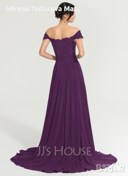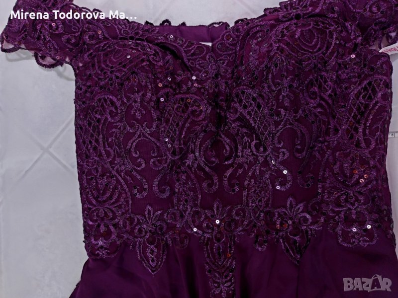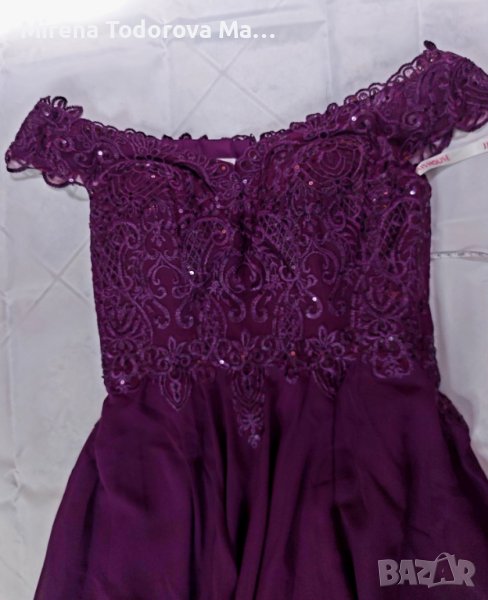Абитуриентска рокля.А-силует вечерна рокля от шифон с отворени раменете с пайети и разцепена предна → Обява 36683884