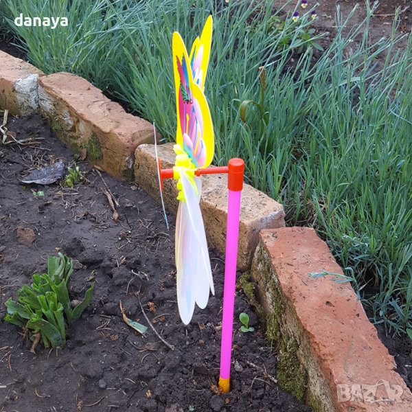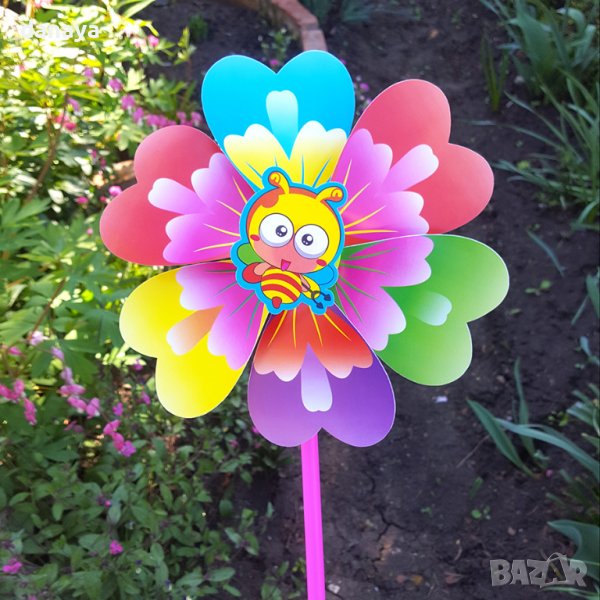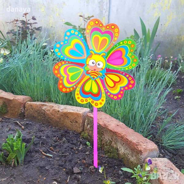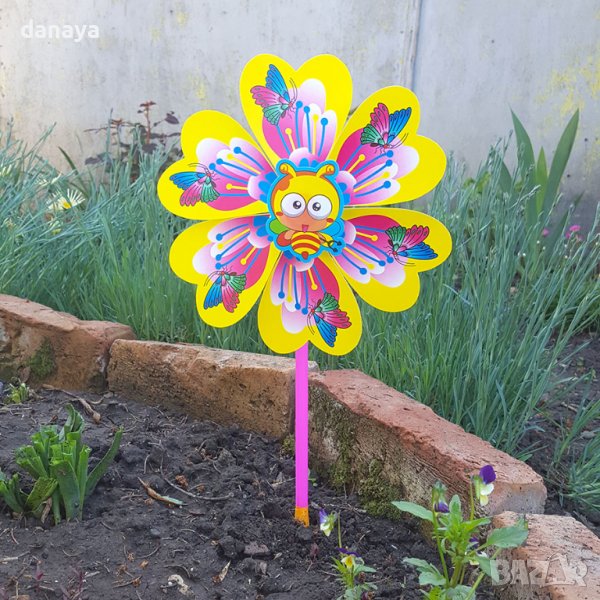 Декорация за градина, балкони, саксии – вятърна въртележка с форма на цвете и животинче отпред. Ветровъртележка в свежи ярки цветове, които ще внесат лятно настроение, където и да ги поставиш. Въртележките се въртят от вятъра. Може да я поставиш в градината като декорация или в саксия.