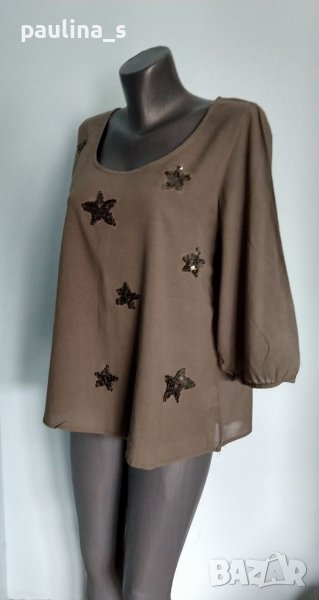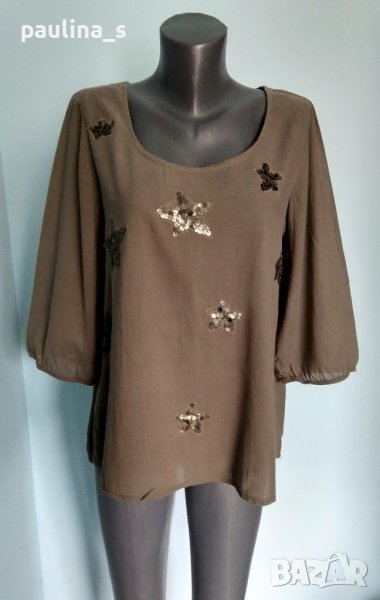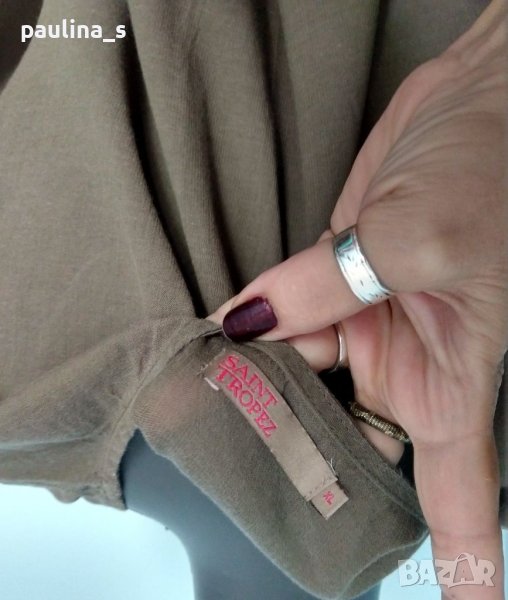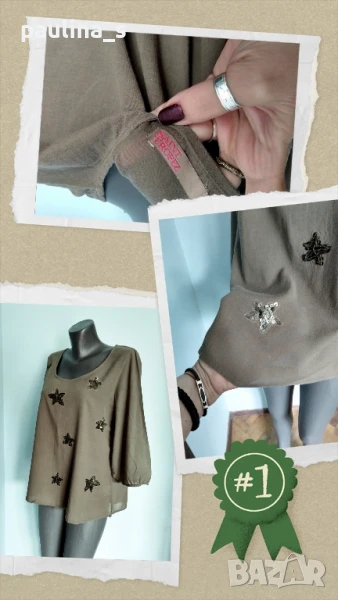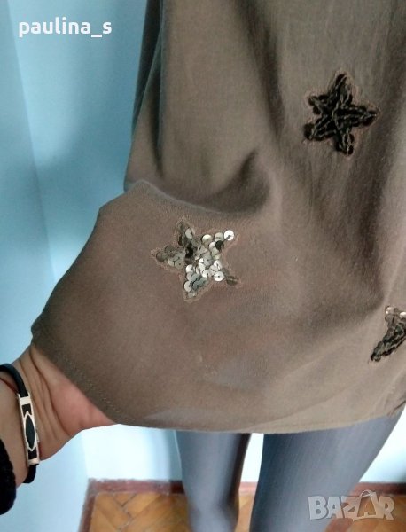 1️⃣. Колаж / L / XL - "Saint Tropez". Цената е крайна 24,99лв / 12,2 евро. Памучна дизайнерски туника с декорации от пайети - зелени звезди. Моделът е с О-образно деколте, буфон ръкави и леко оширение в долната част. Има лек избелващ ефект. Материята е памук и вискоза, много приятна за носене на голо, хипоалергична.