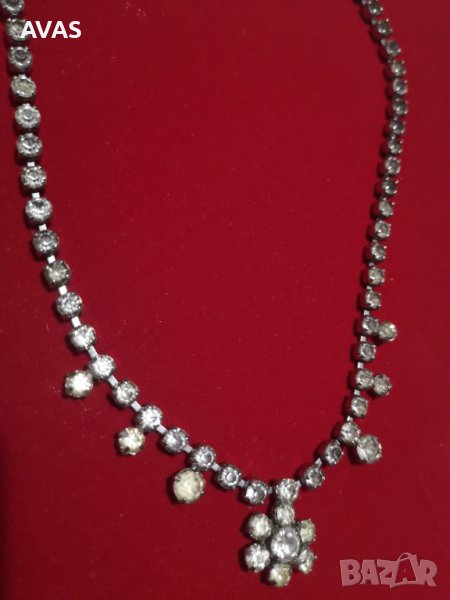 Ново колие сребристо блестящо с кристалчета, форма цвете по средата. Не е много дълго