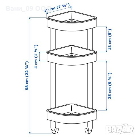 Рафтовете имат високи прегради и са поставени на различни разстояние един от друг, за да предоставят практично пространство за големи бутилки шампоан и по-малки предмети, като гъби.Кукичките са идеални за закачване на неща, като кърпи за миене или ексфолиращи ръкавици.