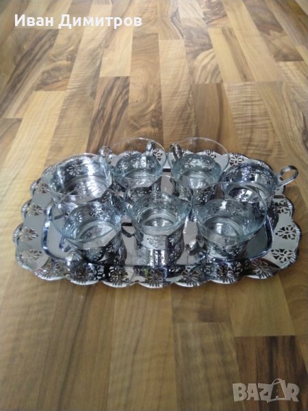 Пет чаши със захарница и поднос.От шестата чаша е останала само металната кошничка.