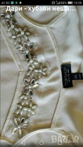 Марка TOPSHOP - 38 р-р.Без забележки, с красив бордюр, съвсем леко прозрачен.Цветът е като на снимките - между пудра и екрю.Материята е полиестер и наподобява жоржет.Може да се носи и над друга дреха.