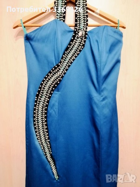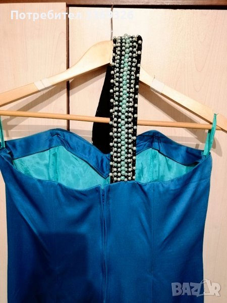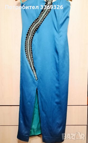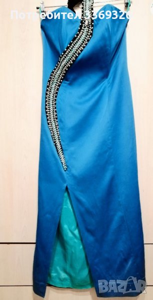 Невероятна тюркоазена бутикова ролкя с ръчко шити маниста. С вертикални банели, които правят силуета на всяка дама прекрасен. С презрамка от камъни и мъниста на едното рамо. Размерите са дължина 110 см. измерена от подмишницата. Гръдна обиколка 49см. Талия 43см. Ханш 51 см. Всички см са измерени еднистранно. Цепка 46 см. Дължина на ципа 36 см. Всяка дама би сияла в подобна рокля.