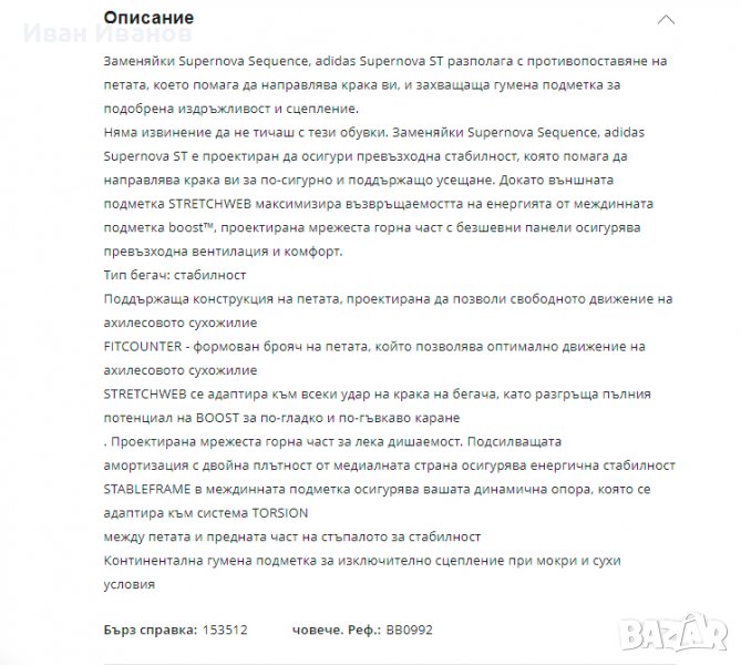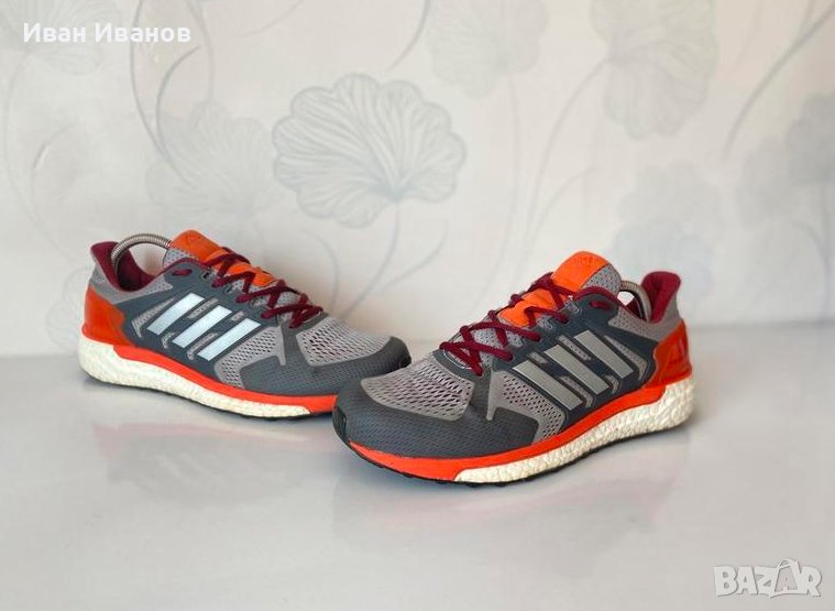 Страхотни маратонки Adidas, изработени от висококачествени материали, подходящи както за спорт, така и за всеки ден. Изключително леки и удобни, изградени чрез система от дишащи панели, за да може крака да остава винаги свеж. Мрежестата материя приляга по извивките на стъпалото и осигурява естественото движение на крака, докато Energized Stability системата на петата елиминира проблемине с изхлузването и поддържа петата. Моделът е с междинна подметка с Boost™ система, която придава допълнителна енергия, лекота и издръжливост при движение и TORSION® система, която придава максимална гъвкавост и поддържа ствола на стъпалото. Подметката е изработена от гума Continental™ за по-добро сцепление на различни терени и при всякакви условия. ADIWEAR™ технологията прави подметката изключително устойчива на износване. Моделът е с характерните отличителни за марката три ленти, които са удебелени и оформят клетка, която не позволява приплъзване на крака в обувката. Перфектно се съчетават с дънки или спортен екип