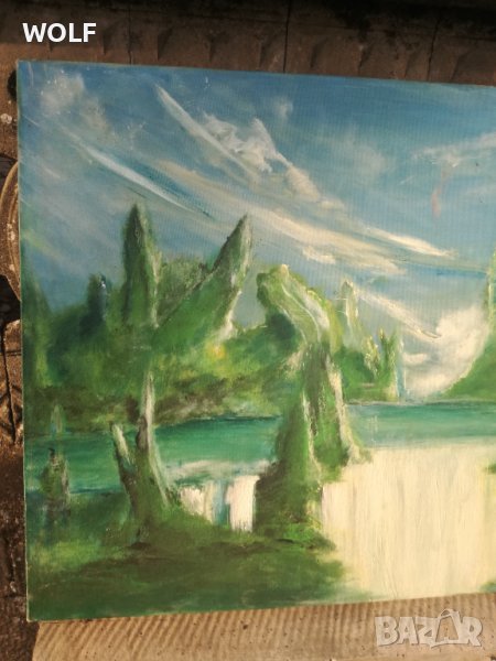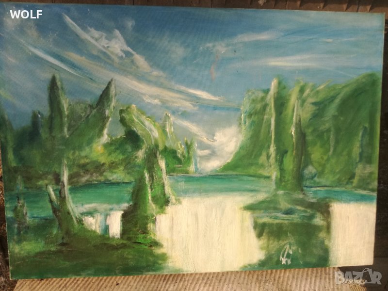 На вашето внимание продавам тая изключително красива картина стил Арт Деко внос германия,маслени бои платно има подпис авторска,в моя поглед изобразява гора планини и извираща вода езеро,картината е с размер 100см на 70см,дебелина 3.5см,идеална за хол офис бюро ресторант и най-различни места да
