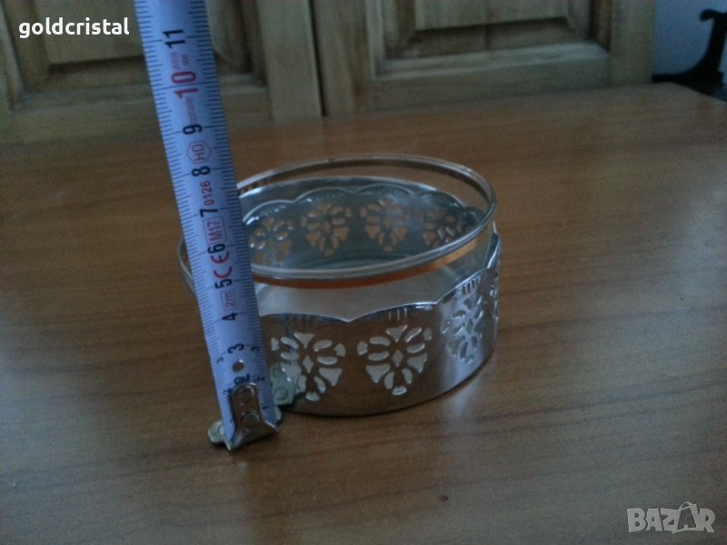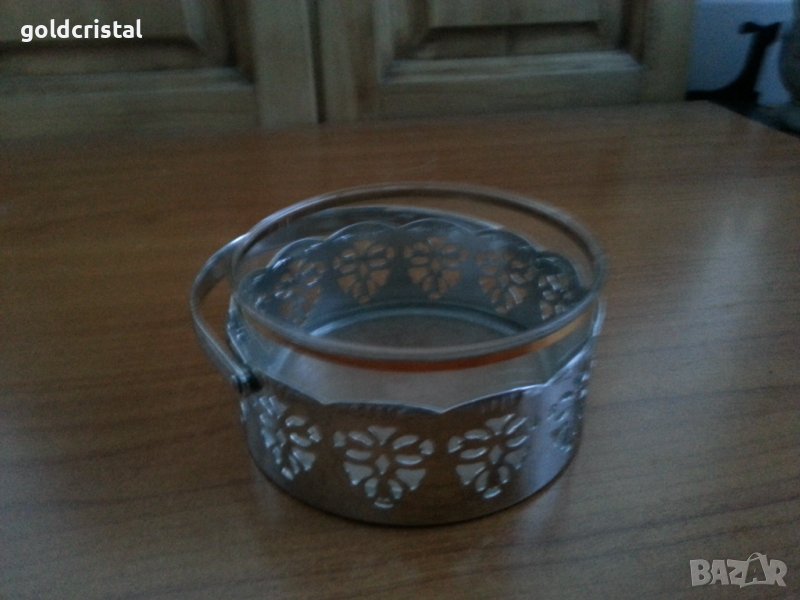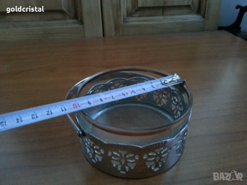 Руска купичка захарница бонбониера ледарка стъклена с златен кант и метална неръждаема поставка. Ретро арт декор винтидж колекция стара стари антикварни предмети обзавеждане за дома и семейството подходяща за подарък за ценители и колекционери