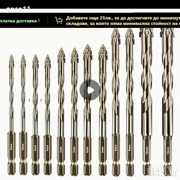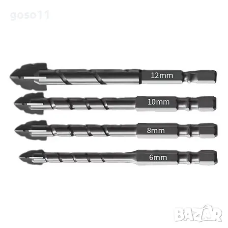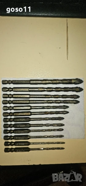 -- снимка 10, 11, 12 : материал - карбидна стомана ; употреба - върху керамика, бетон, стъкло, дърво, пластмаса, тухла, гранитогрес ; комплект - 12бр. ; налични - 1 к-т ; цена - 14,40€./к-т