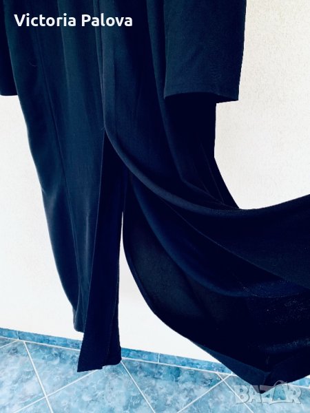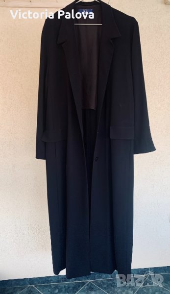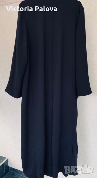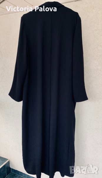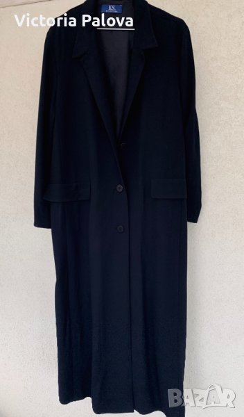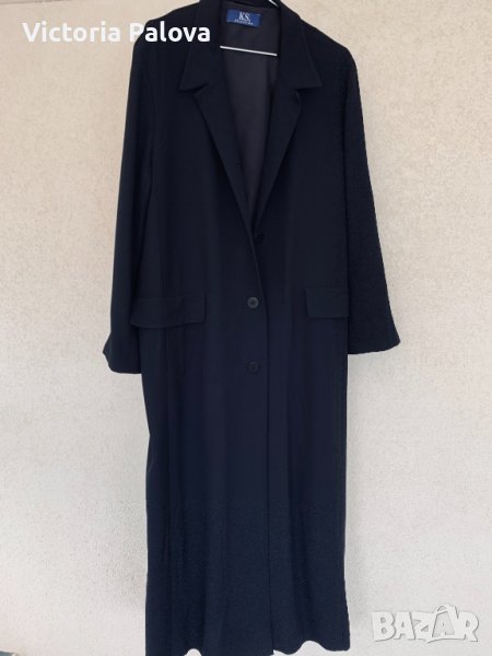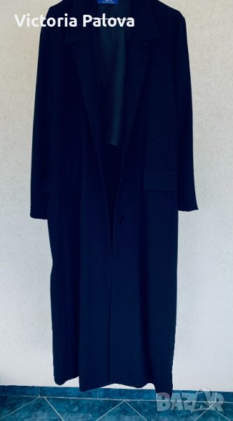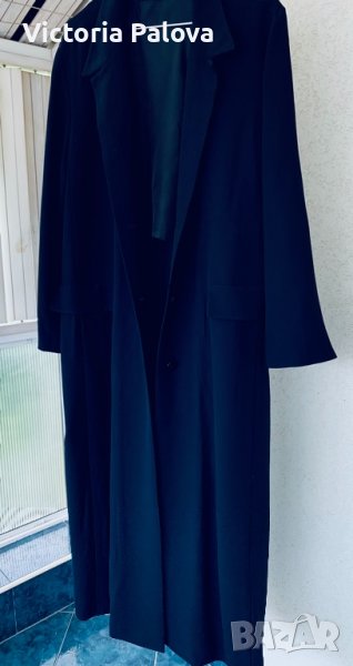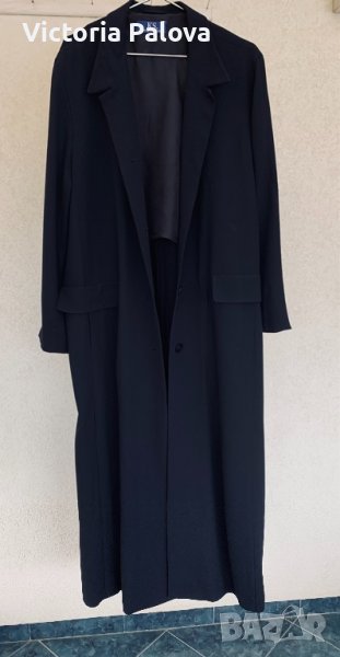 Жилетка или лятно палто-без подплата,пада тежко,висок шлиц,два странични джоба и един вътрешен,цвят тъмно-син до черен.стилно и красиво,прекрасно допълнение към всички тоалети.рамене-47-48см,дължина-134см,ГО-58-59см,ръкав-59см.