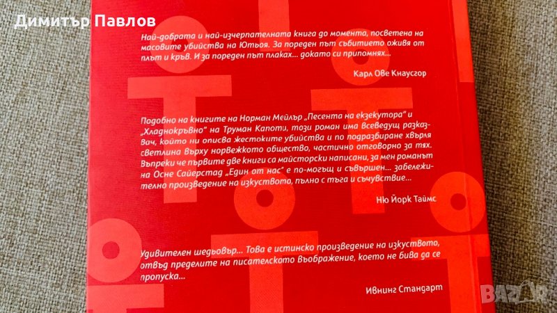 Най-добрата и най-изчерпателната книга до момента, посветена на масовите убийства на Ютьоя. За пореден път събитието оживя от плът и кръв. И за пореден път плаках... докато си припомнях. / Карл Ове Кнаусгор/