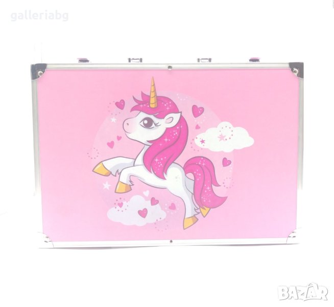 Страхотен комплект в голям стилен куфар с изображение на пони. Комплекта включва много моливи, боички, четки, гуми и острилка.