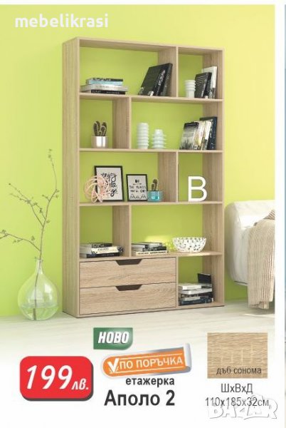 "Аполо 2" представлява практична етажерка, подходяща за обзавеждане на хол, дневна или офис. Моделът е оборудван с: множество рафтове и две чекмеджета. Изработва се от ПДЧ, в цвят дъб сонома.