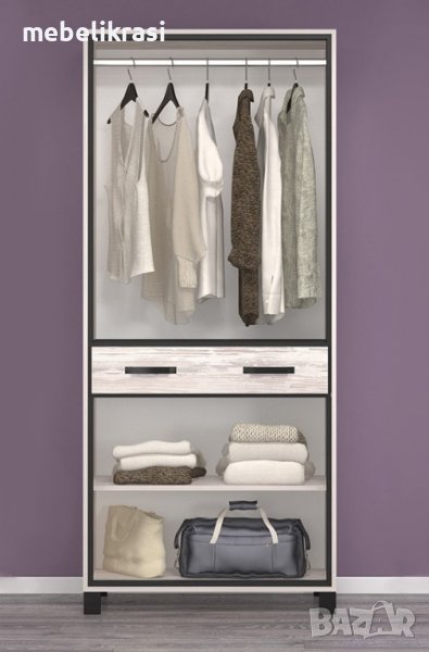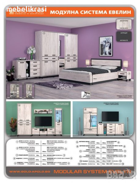 "Евелин 1" представлява модулна секция, подходяща за обзавеждане на хол или дневна. Комплектът е съставен от: ТВ шкаф с вратички. Шкаф с витрина, LED осветление, вратички и рафтове. Двукрилен гардероб с вратички, чекмедже, лост за закачалки и рафтове. Стенна етажерка с рафт. Модулите са отделни един от друг, което ще Ви позволи да ги подредите по Ваш избор. Обзавеждането се изработва от ПДЧ, в цветовете: дъб бланко и антрацит.