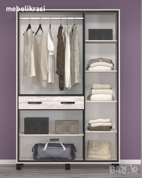 "Евелин 2" представлява модулна секция, подходяща за обзавеждане на хол или дневна. Комплектът е съставен от: ТВ шкаф (скрин) с вратички, чекмеджета и ниши. Висок шкаф с витрина, LED осветление, вратички и рафтове. Модулите са отделни един от друг, което ще Ви позволи да ги подредите по Ваш избор. Обзавеждането се изработва от ПДЧ, в цветовете: дъб бланко и антрацит.