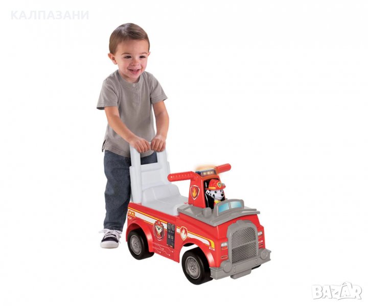 Маршал е готов за спасяване! Това уникално проектирано превозно средство е вдъхновено от превозното средство на Маршал от шоуто и разполага с дръжки с бутони за активиране за звукови ефекти, мигащи светлини и песента за тема PAW Patrol. Изваяна фигура на Маршал седи на шофьорската седалка и води детето през техните приключения. Добавена стойка за хващане помага на малките в ранните им етапи на ходене и включва място за съхранение под седалката за любимите им неща.