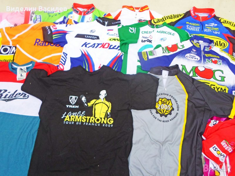 Колекционерски/на профи отбори/ фанелки. При интерес пращам допълнителни снимки с размери. Памучна/T shirt/35 лв. Рекламна/T shirt/Армстронг 39 лв .Nike Livestrong/ХЛ/ 39 лв.Сантини/червена Джиро/ М 30 лв. Сантини/лилава Джиро Л/20 лв. Катюша/Л/ 50 лв.