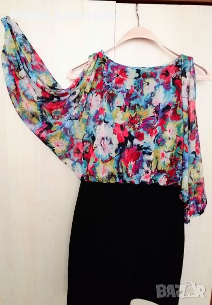 Невероятна рокля Atmosohere. Обличана веднъж за повод. С отворени ръкави. Полата е от ластична материя която приляга чудесно. Горната част е с флорарни мотиви, ситен принт. Леко прозрачна, но отдолу има потник от по плътна материя. Дълж.65см. талия 38см