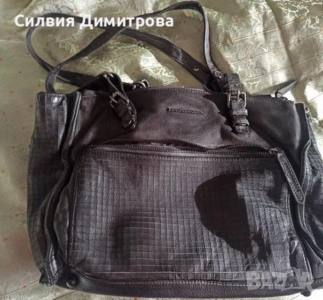 Чантата е с изключителни качество , естествена кожа , много тъмно сиво към черно . Голяма с много разпределения , двете са с цип , а средното с магнитно копче ,логото се вижда и на металните елементи , височина 27 , ширина 36 , дъно 12 .Минимални следи от употреба , забележка-няма дълга дръжка .