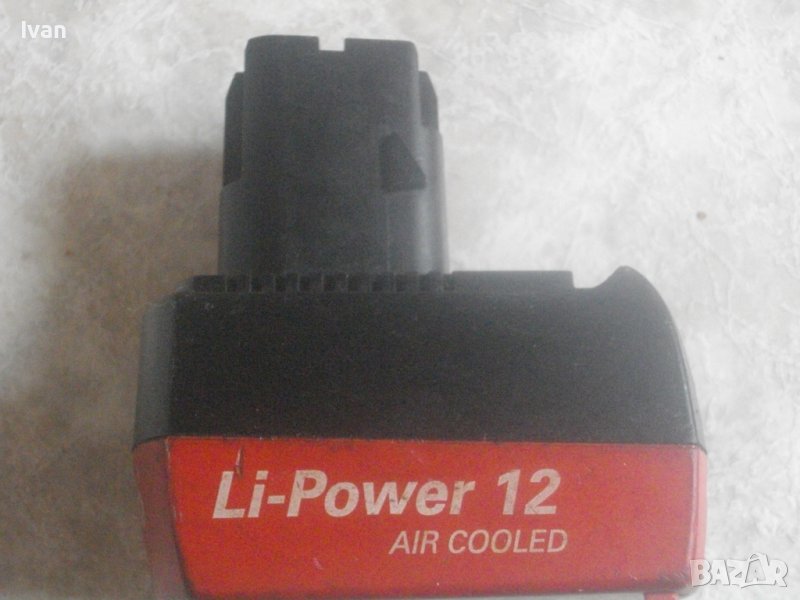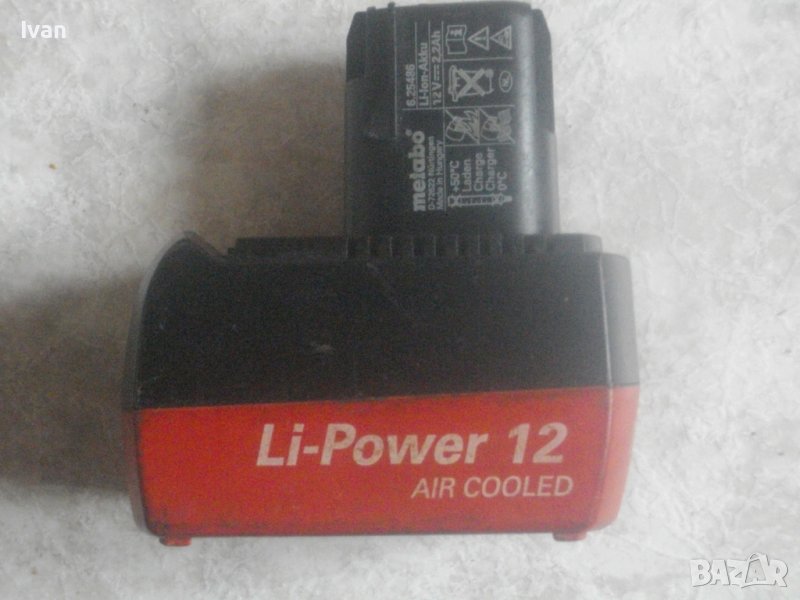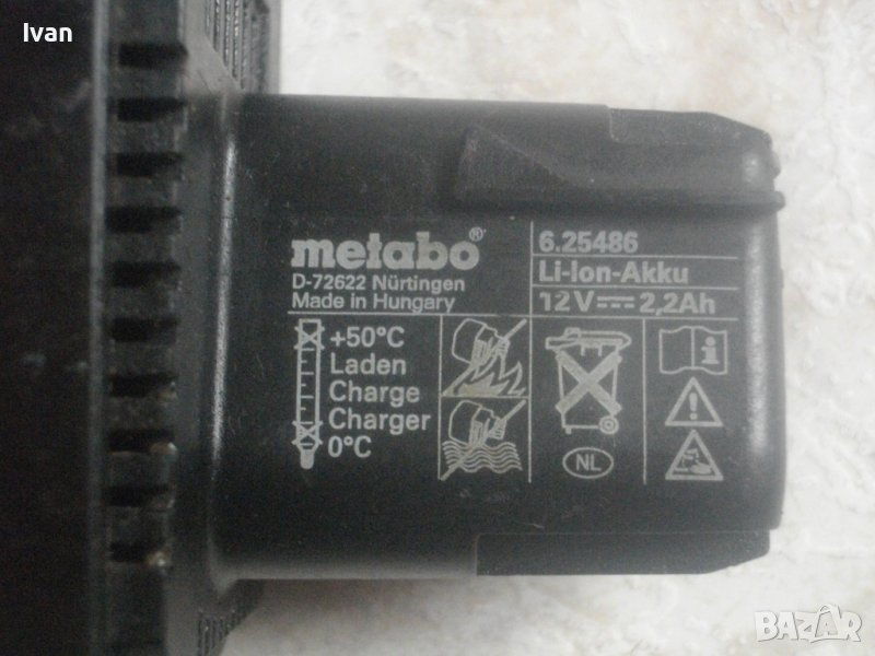 Описание на 12 волтова батерия - 2,2 ампера. Захабен външен вид, но мощна и силна професионална батерия,литий-йон технология,модел на Метабо,за моделите винтоверти на Метабо,от 9,6 до 12 волта.Производство на батерията-Унгария. Марка и модел-Metabo Li-Power 12 Air COOLED.Батерията е много малко ползвана,,почти нова,с много запазен външен вид и отлично техническо състояние.Силна,мощна,зарежда се продължително и държи силен ток.12 волтова,2,2 ампера,литий-йон елементи.Без ефект-Памет.Технология въздушно охлаждане при зареждане.Функция постоянно ел.наблюдение,осъществено от електрониката.Единична клетка ESCP натоварване за особено дълъг живот на батерията.Функция претоварване-при предупреждение за критична температура,електрониката изолира батерията.Цената на нова батерия от модела към настоящият момент струва много над 200 лв.