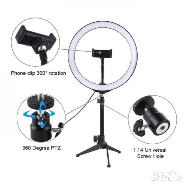 Лед ринг лампа с държач за телефон и трипод в комплекта - топла, студена и неутрална светлина с 10 степенно регулиране на на яркост.