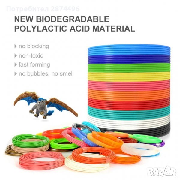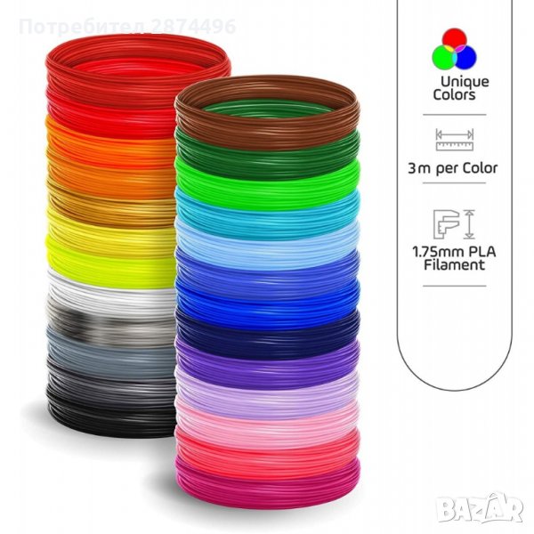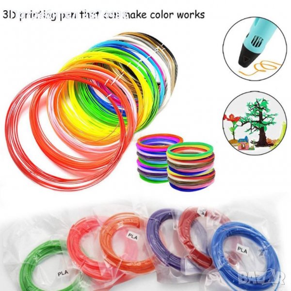 Комплектът съдържа пластмасови цветни пълнители в 12 цвята, всеки по 3 метра (общо 36 метра) или в комплект 18 цвята, всеки по 3 метра (общо 54 метра). Подходящи за 3D Писалка Вид на пълнителите: PLA