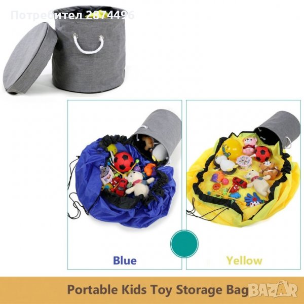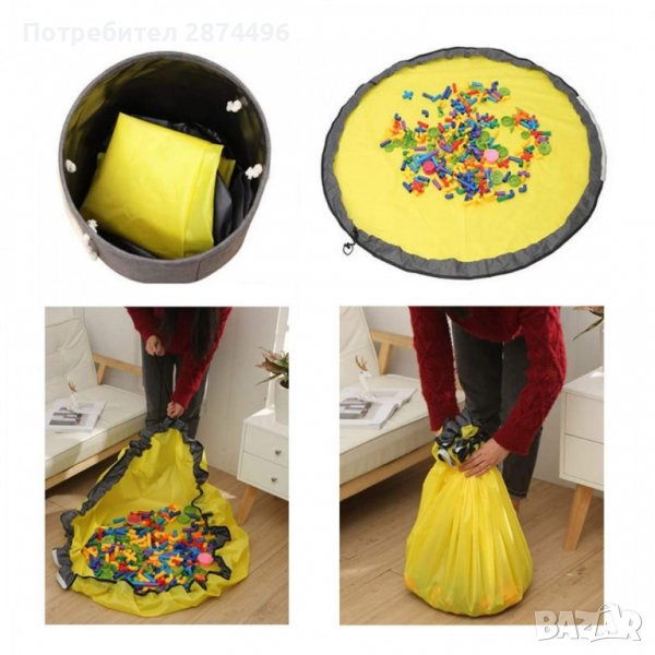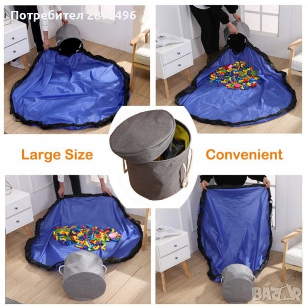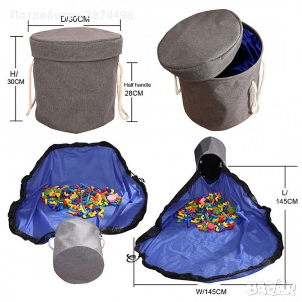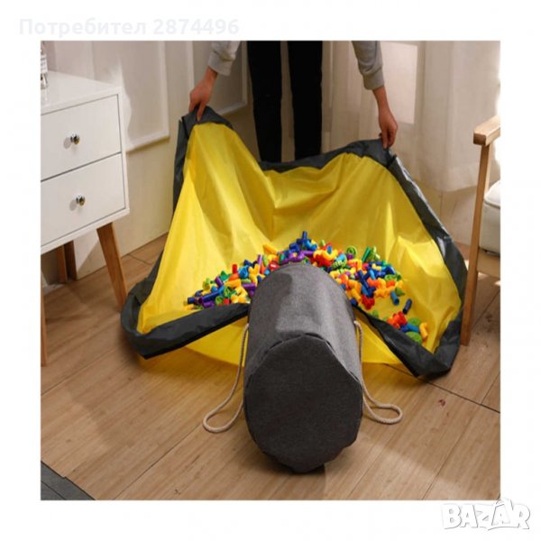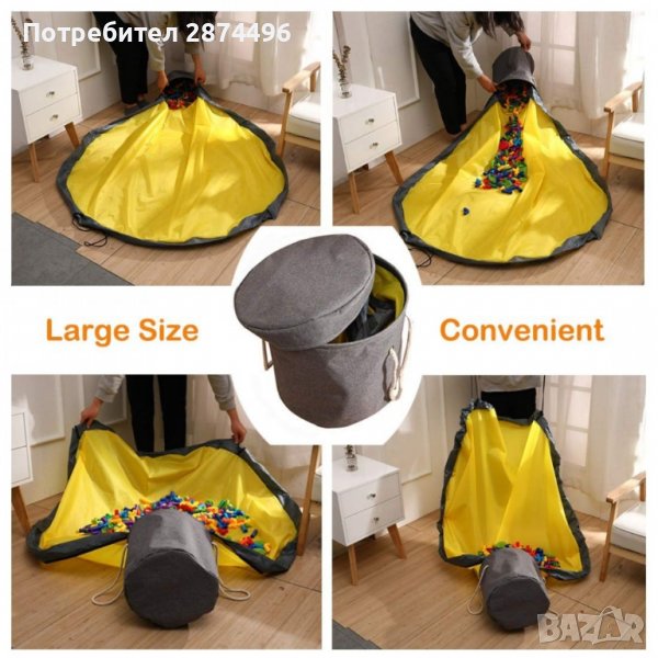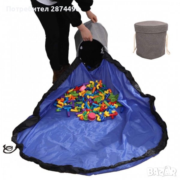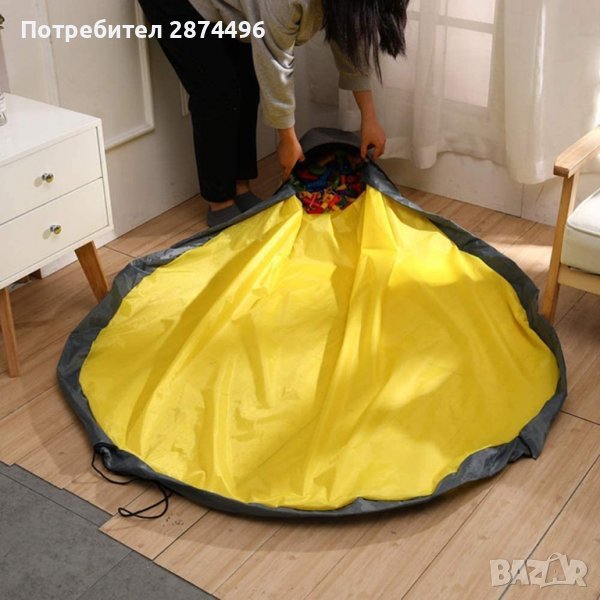 Омръзнало ли ви е да повтаряте постоянно на детето "Прибери си играчките!"? Ако да, това е решнието за вас! Тази голяма и удобна чанта прибира и съхранява хилядите дребни и не толкова дребни детски играчки. Когато се разтвори, чантата служи за подложка за игра, а след това само с едно дръпване на шнура, чантата се затваря и всички играчки остават в коша за играчки.