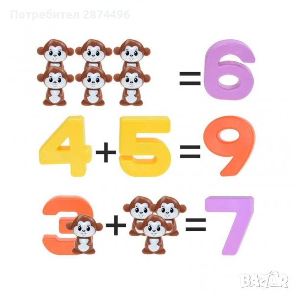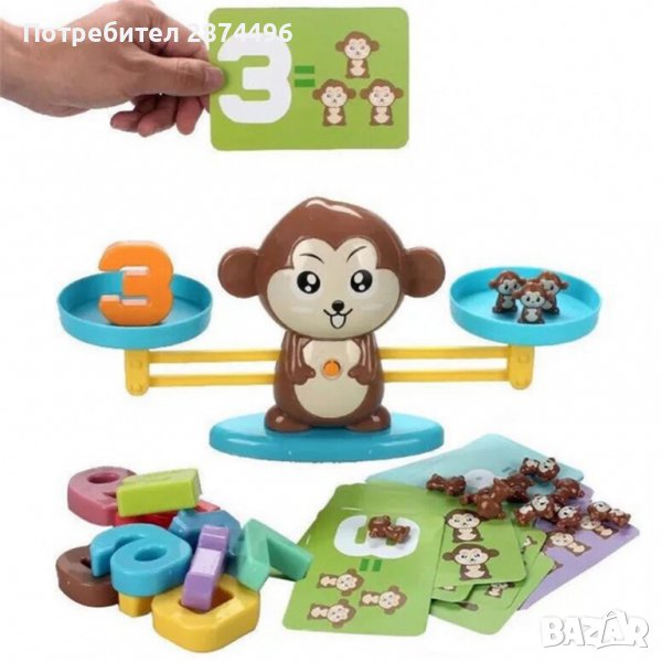 Този комплект за играчки от 65 части включва: 19 маймуни, номера 1–10, 30 двустранни карти, маймунски скала, основа, 2 везни и лесна за четене листовка с инструкции;