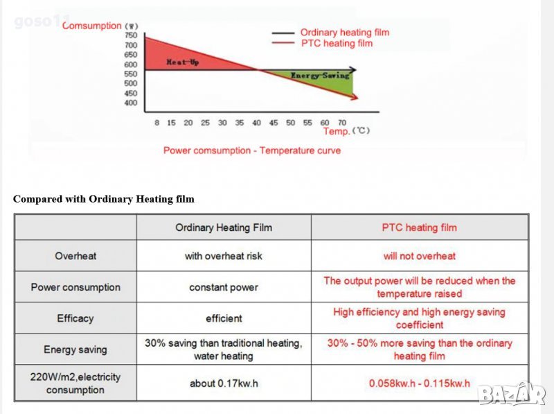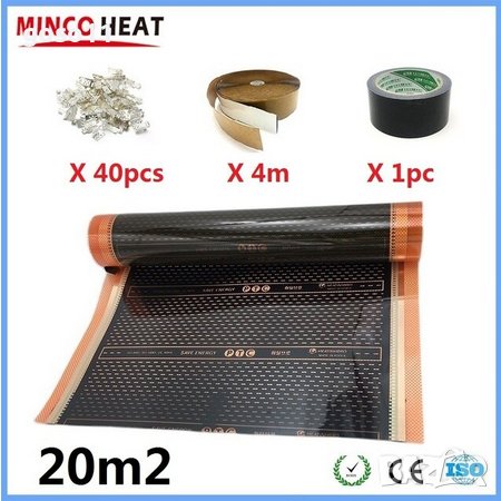 комплекта включва - нагревателно PTC инфрачервено графитено фолио : 15кв. + 5кв.. , ширина -50см. , дебелина - 0.4мм. - 0,338 , произведено в Корея , изходяща мощност - 240W/m2 , консумирана енергия - 58 W/h - 115 W/h на квадратен метър, със всеки изминал час консумацията на ток пада с 0,01W/m2 ,