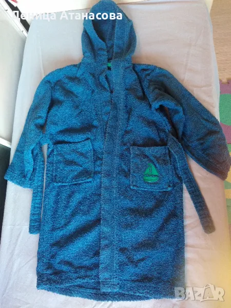 - Тъмносин хавлиен халат с качулка, две джобчета и зашито коланче, много добре попива, 100% памук, размер 122/128 - 10 лв.