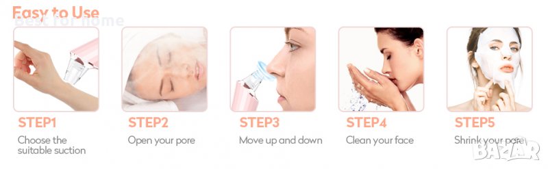 - Уреда за черни точки се предлага с 4 сонди с различни форми на засмукване, за да отговори на различни нужди на лицето. Различни сонди могат да се прилагат към различни части на лицето за решаване на различни проблеми.