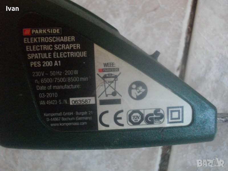ОПИСАНИЕ НА НЕМСКО ДЛЕТО ШАБЪР ПАРКСАЙТ: НАЛИЧНО. Немско електрическо длето - машина Шабър, 200 ватов модел на Парксайд. Марка и модел на машината - Parkside PES 200A. Производство - оригинално Германия - Germany - 2010г. Машината е с добър външен вид и работи добре, с добри ротационни движения и вибрации.