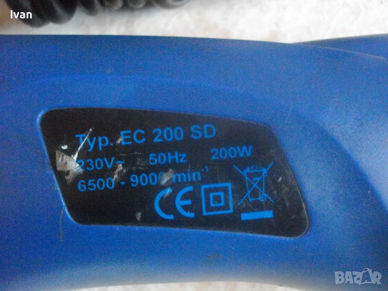 Марка и модел - Westfalia EC 200 SD. Производство - оригинално Германия - упоменато на маркировките. Производител - Industriestr. Hagen. Машината е почти нова ,с много запазен външен вид И техн.състояние - описаното по-горе. Регулатор на скоростта - 6 степени. Мощност на мотора - 200 вата. Обороти - 6 500 - 9 000 об./мин. Заден пусков ключ с антипрахово силиконово покритие. Заключваща блокировка на поставеният аксесоар. Професионална дължина захранващ кабел - 300 см. Щепсел - евростандарт. ЦвЯт на машината - наситен син. Към машината има 1 бр. оригинален немски аксесоар - шпакла от мека стомана, с работна ширина - 60 мм.