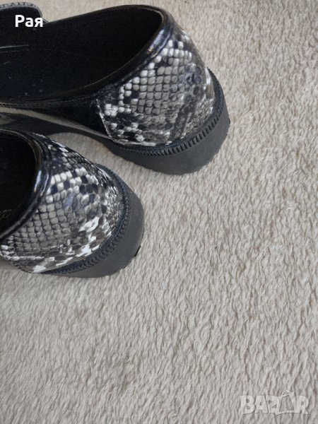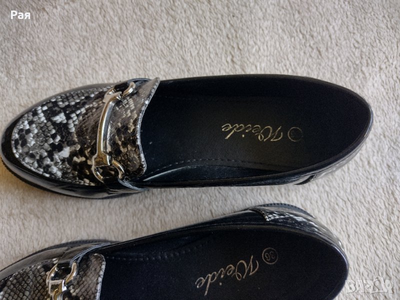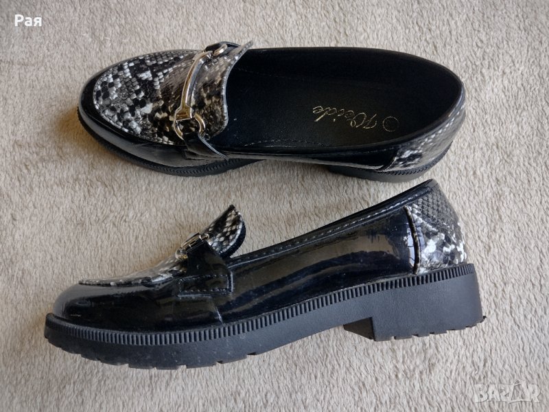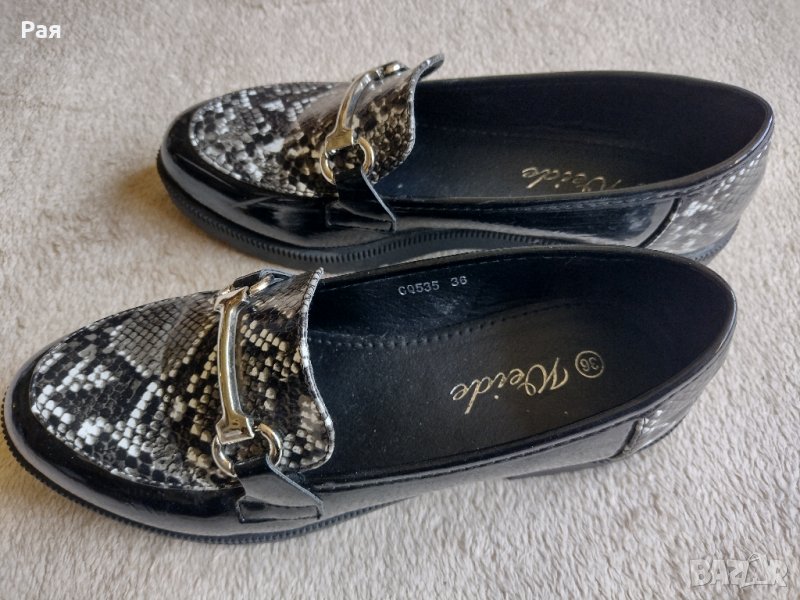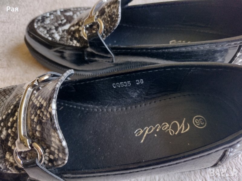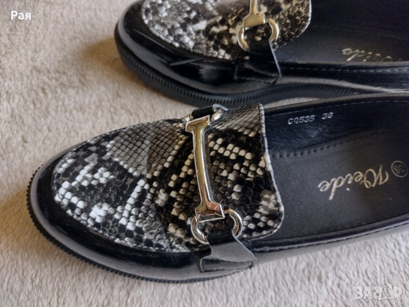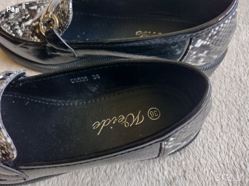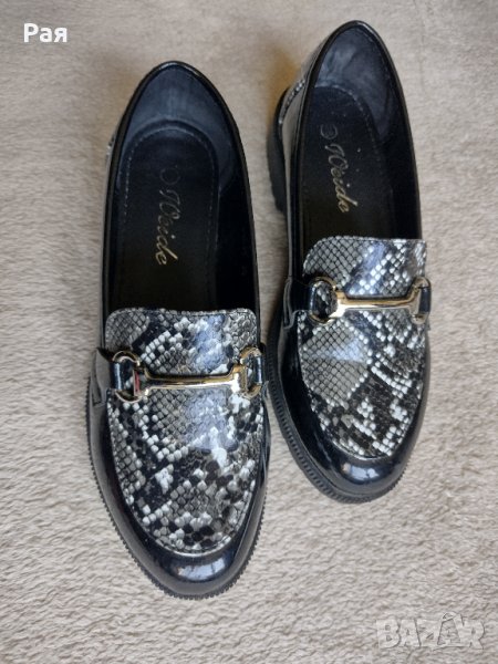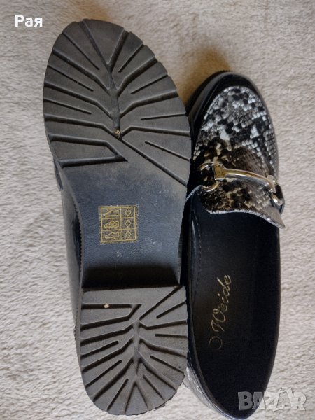 Дамски мокасини (лоуфъри) на марката Weide, отличаващи се с комбинация от черен лак и змийски принт. Този модел е елегантен и подходящ за ежедневието, като включва класическа метална декорация тип "horsebit" на свода.