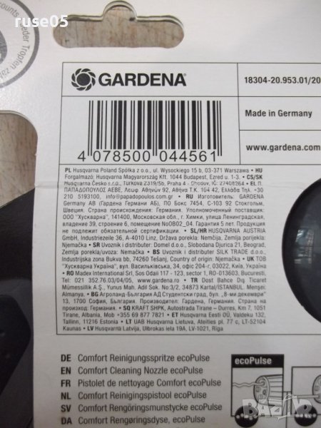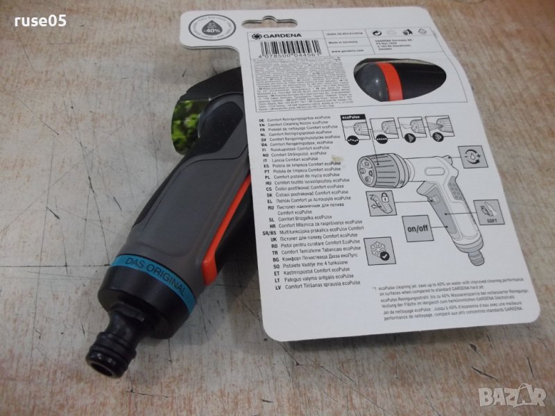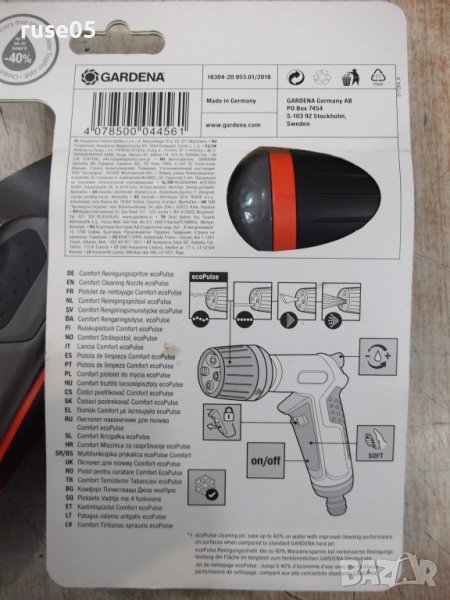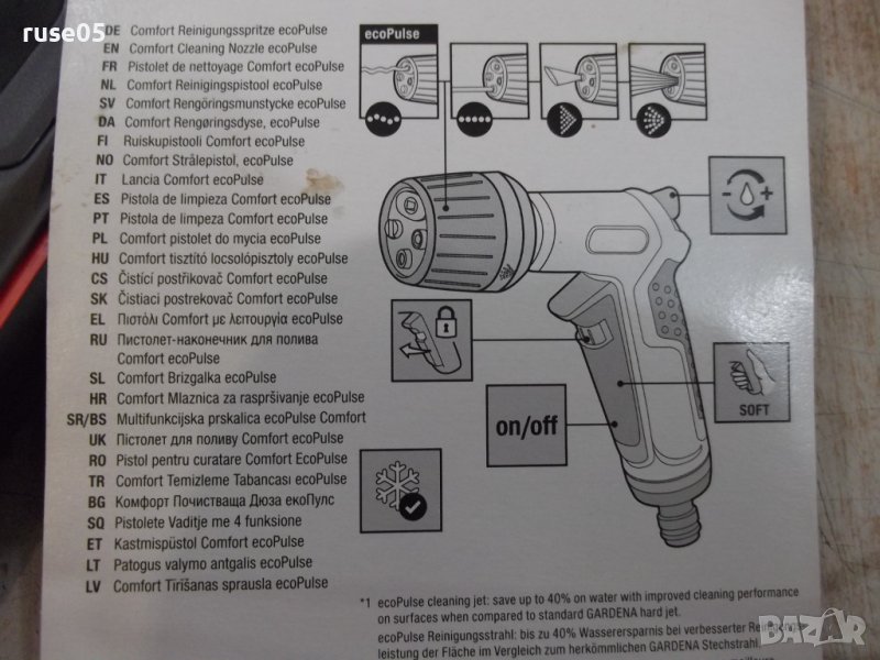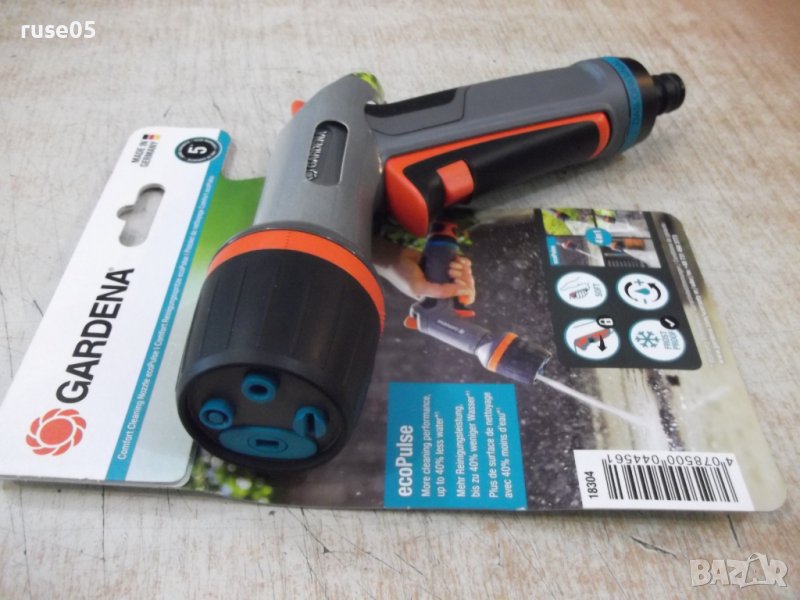 Пистолет "Gardena ecoPulse" с 4 вида струи за поливане и почистване . Осцилиращата водна струя е особено ефективна при миене на повърхности и спестява до 40% от водата в сравнение със стандартната струя . Предлага и още три режима на струята: твърда струя , плоска струя и водна мъгла . Ергономичната ръкохватка с меки пластмасови компоненти осигурява оптимален комфорт по време на работа . Водният дебит се регулира безстепенно . При продължително миене или поливане , спусъкът може да се заключи за намаляване умората на ръката . С вградена технология за защита от замръзване . Удобно регулиране на дебита с една ръка , разполага и с ергономичен спусък с мека вложка и заключване . Разполага с иновативна система за защита от замръзване и мек пластмасов предпазител на разпръскващата глава , който я пази от повреждане . Изпращам по Еконт или Спиди с опция преглед !